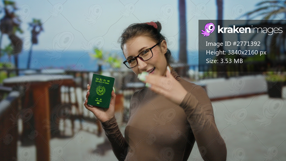 Woman holding korean passport on sunny outdoor terrace at restaurant showing identification visa