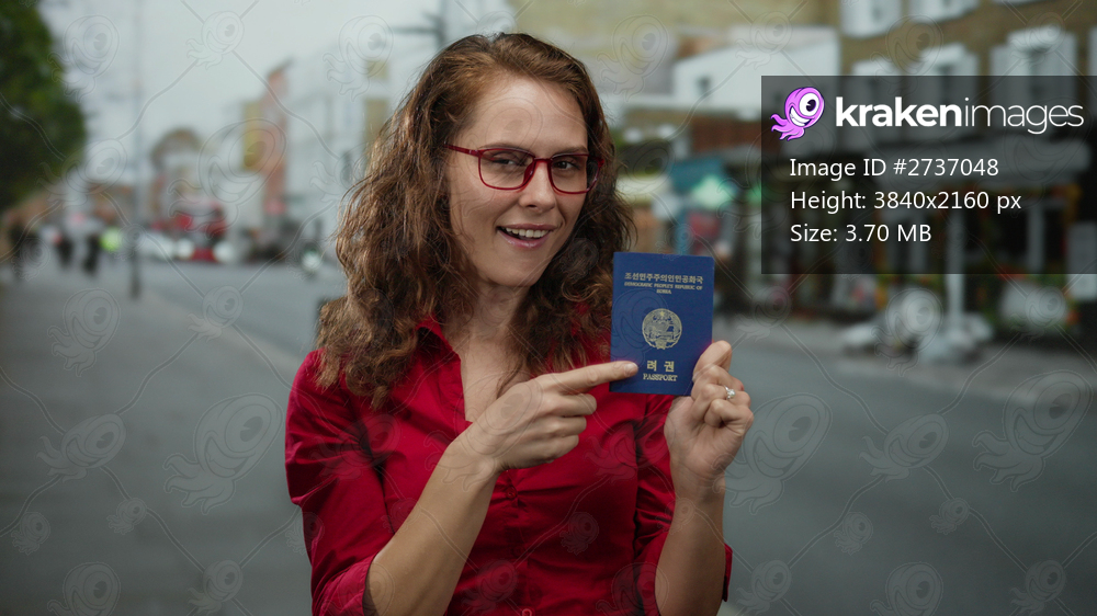 Woman holding korean passport outdoors showing thumb up while smiling on city street background.