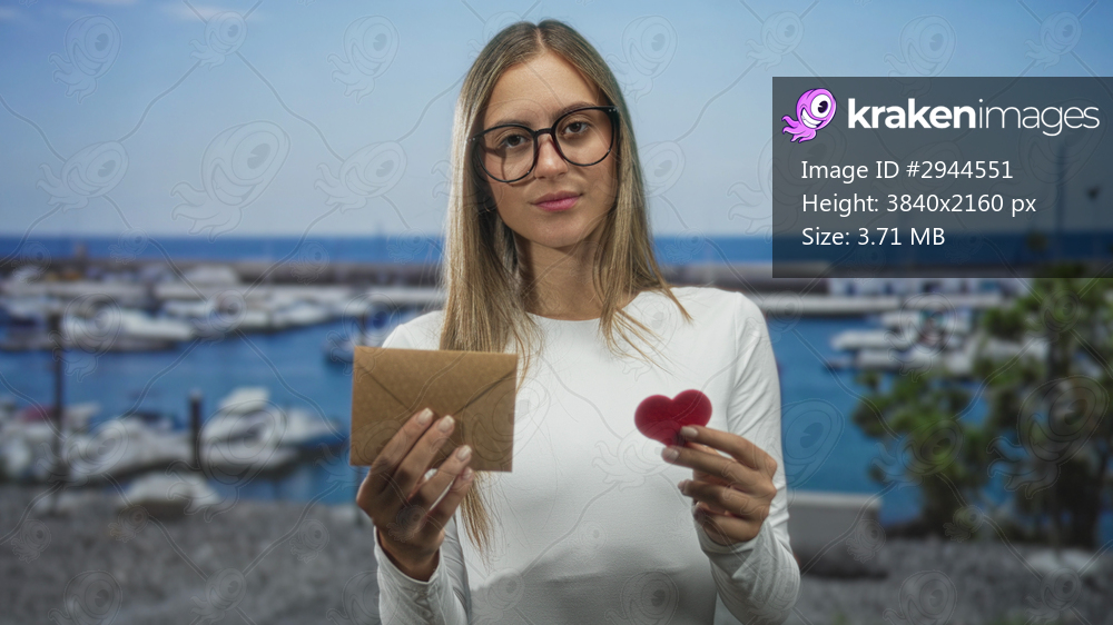 Woman holding kraft envelope and red heart at marina pier with boats in view, wearing glasses and white shirt; romantic longing.