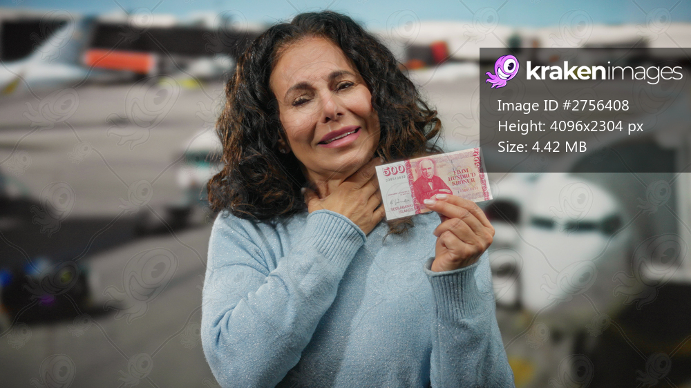 Woman holding krona banknotes at airport terminal appears stressed about travel finances, set against blurred airplane and busy airfield backdrop, symbolizing travel expenses.