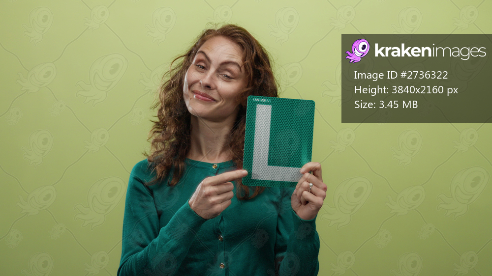 Woman holding l plate against a yellow background, expressing learning and confidence in driving with a playful smile and thoughtful gestures, isolated and ready for new experiences. - Kraken Images