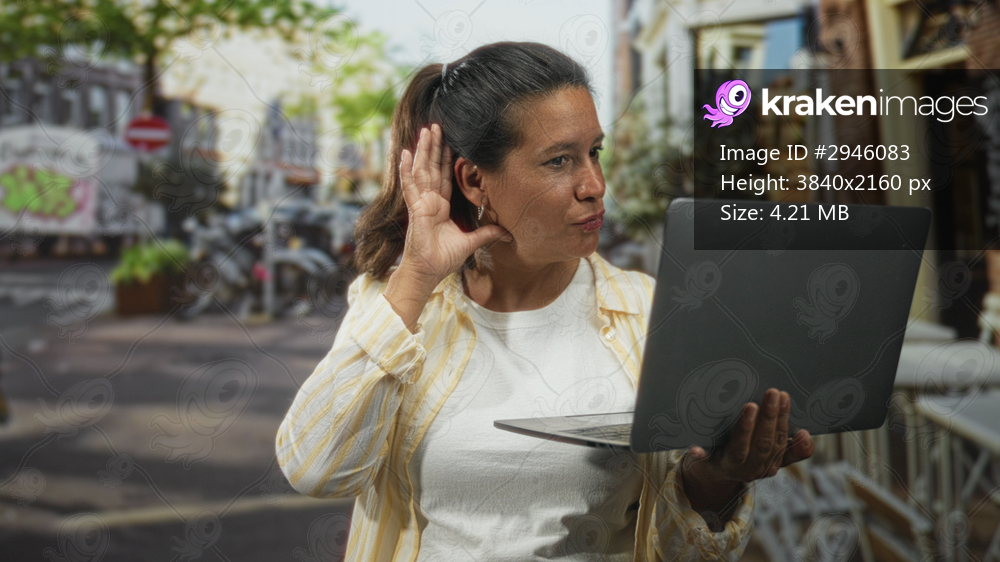 Woman holding laptop, hand cupped to ear listening on a street cafe sidewalk, looking attentive and checking video call on screen; curiosity connection. - Kraken Images