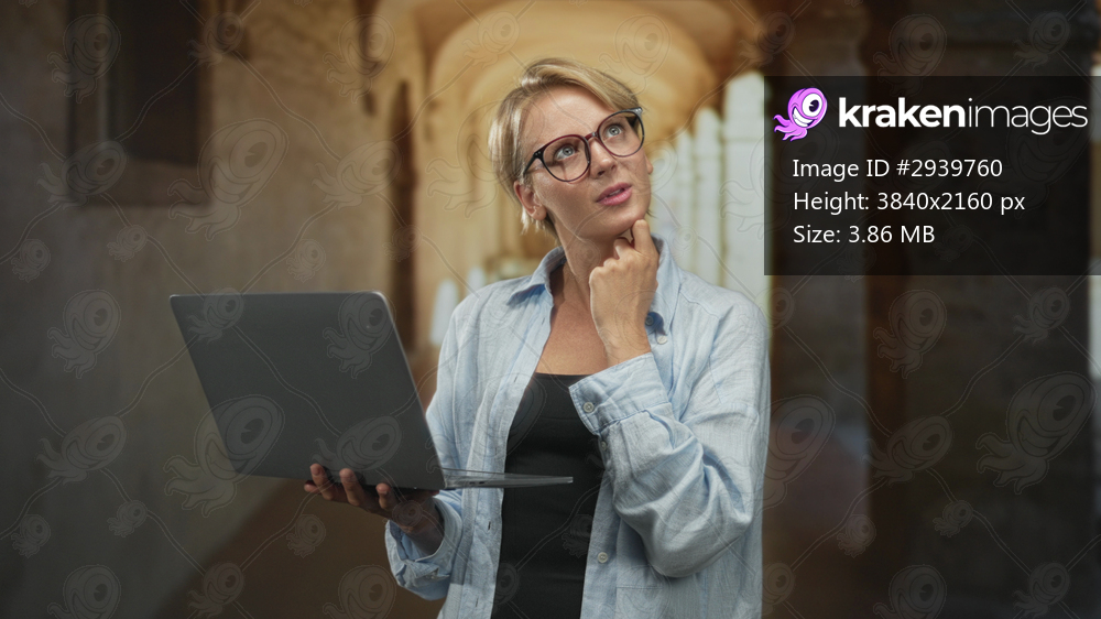 Woman holding laptop with hand on chin and raised index finger, wearing glasses in a stone arched corridor building; thoughtful focus.