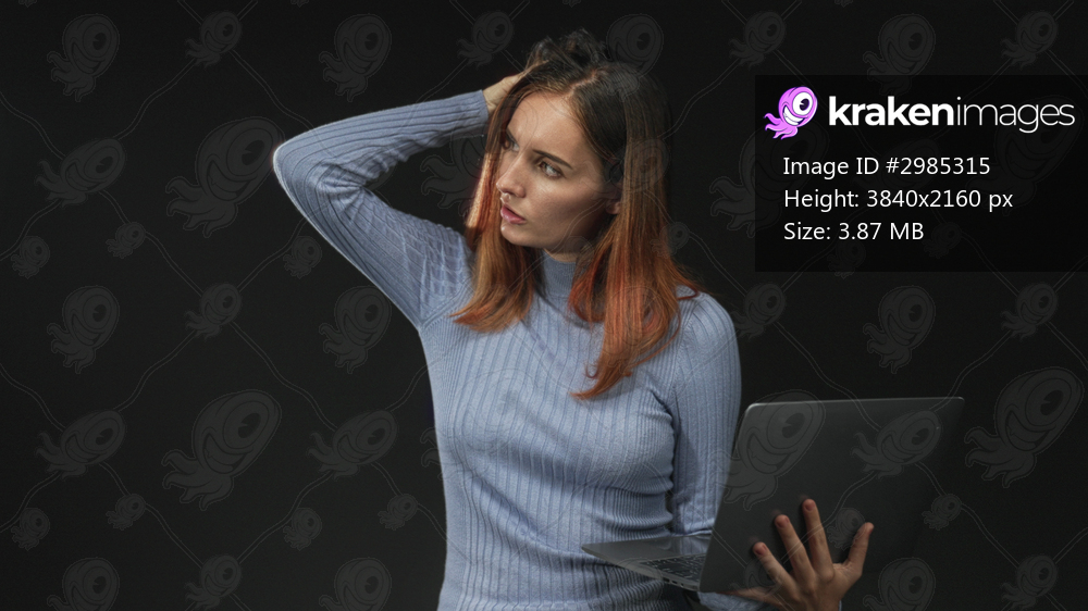 Woman holding laptop, hand to head and looking puzzled in studio wearing blue turtleneck sweater; frustration tech stress.