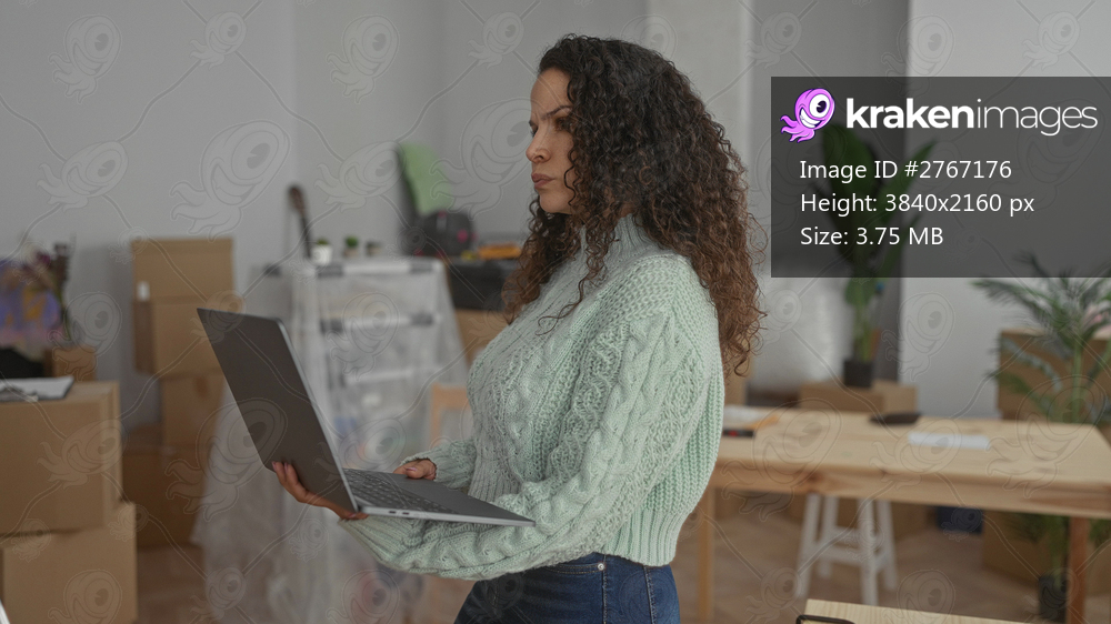 Woman holding laptop in modern living room of new home with cardboard boxes around, wearing cozy sweater, indicating unpacking process and technology use in home environment. - Kraken Images