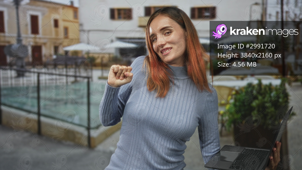 Woman holding laptop with left hand and fist pumping with right hand on street cafe, smiling and dancing while looking at screen; joy celebration.