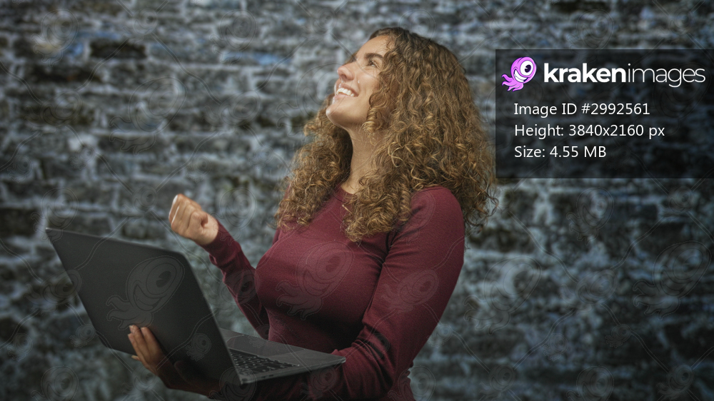 Woman holding laptop with left hand and right hand raised in a loose fist while smiling in studio; confidence success optimism.