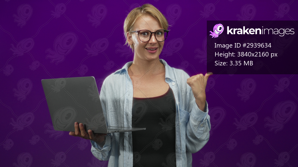 Woman holding laptop and pointing finger gesture in studio with purple backdrop and eyeglasses; confidence teaching online.