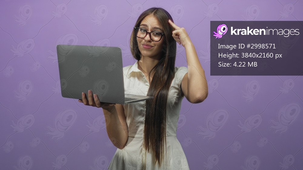 Woman holding laptop and pointing finger to head in studio with purple backdrop; thinking confidence.