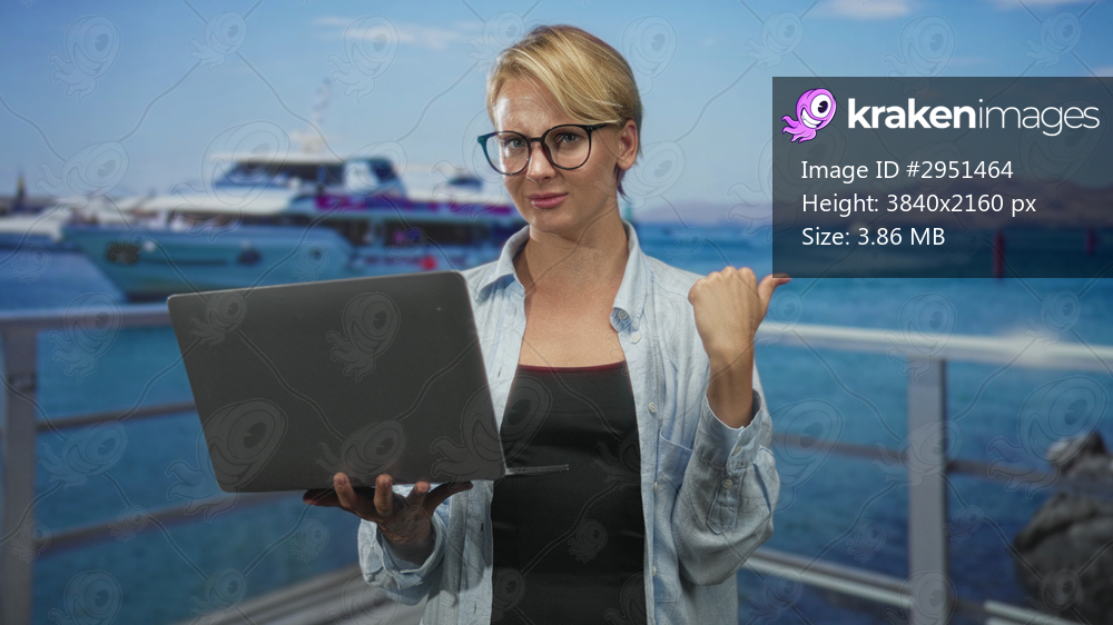 Woman holding laptop and points finger at screen on yacht pier backdrop in studio; confidence guidance.