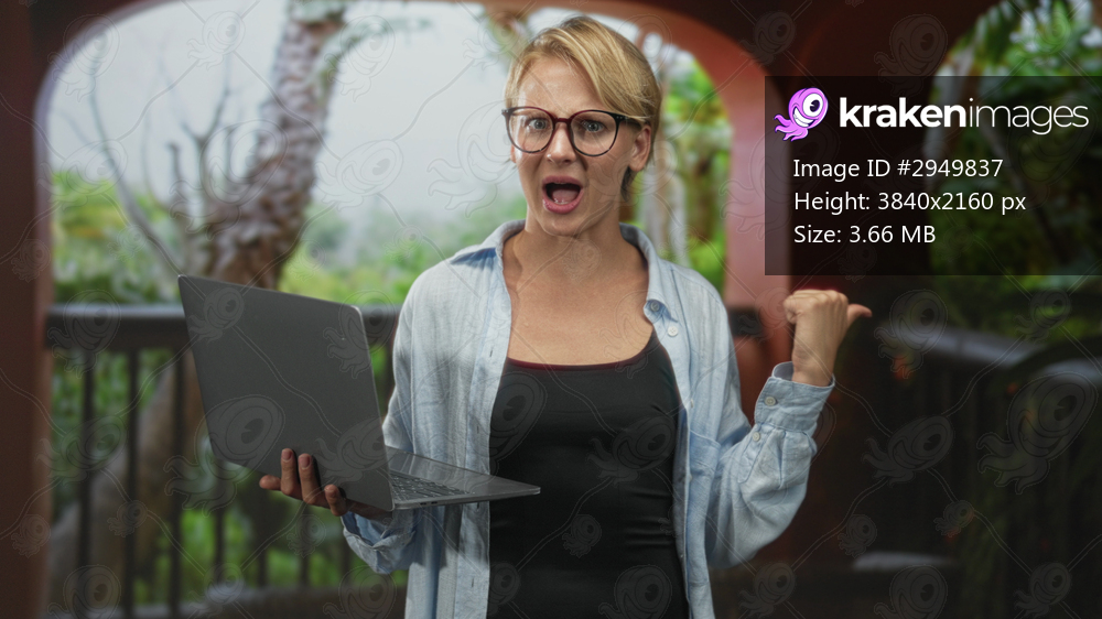 Woman holding laptop, right hand on hip and fist pump gesture in building balcony archway; confidence success.