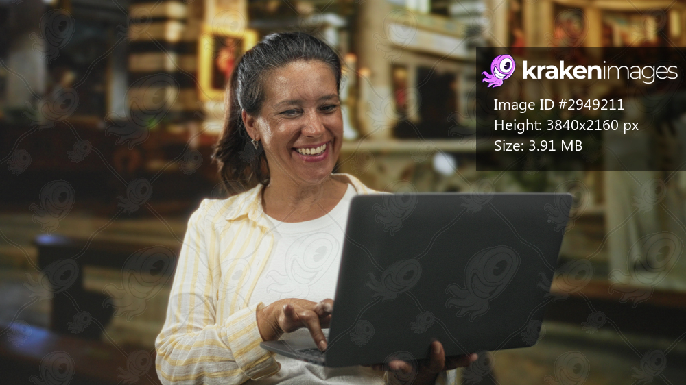 Woman holding laptop and tapping the keyboard with her right hand in an ornate church interior, smiling while looking at the screen; joy.