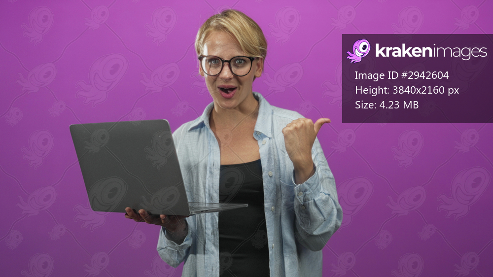 Woman holding laptop and thumb pointing to side in studio wearing glasses and casual shirt, purple backdrop; surprise discovery.