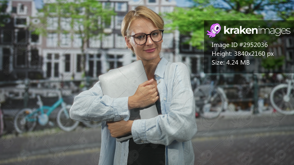 Woman holding laptop to chest on a street by canal houses and parked bicycles, wearing glasses and a light blue shirt, smiling at camera; serenity.