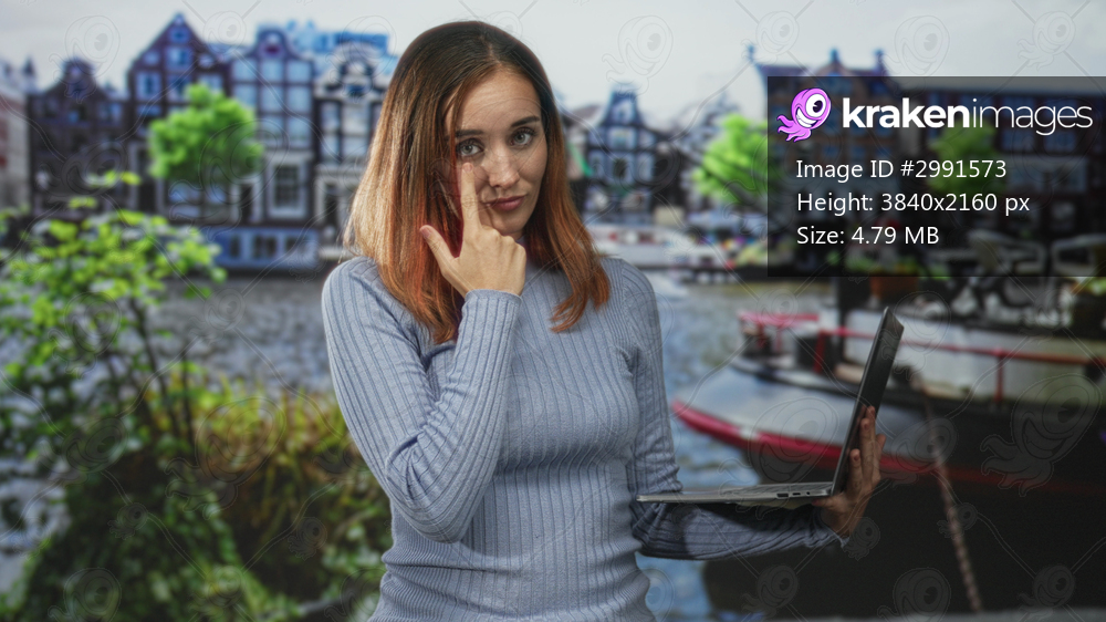 Woman holding laptop touches corner of eye with finger in studio canal backdrop; remote work fatigue.