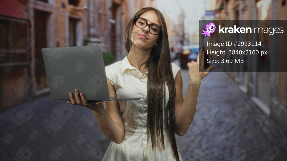 Woman holding laptop and touching long brunette hair while frowning on a narrow cobblestone street between storefronts and a parked car; frustration.
