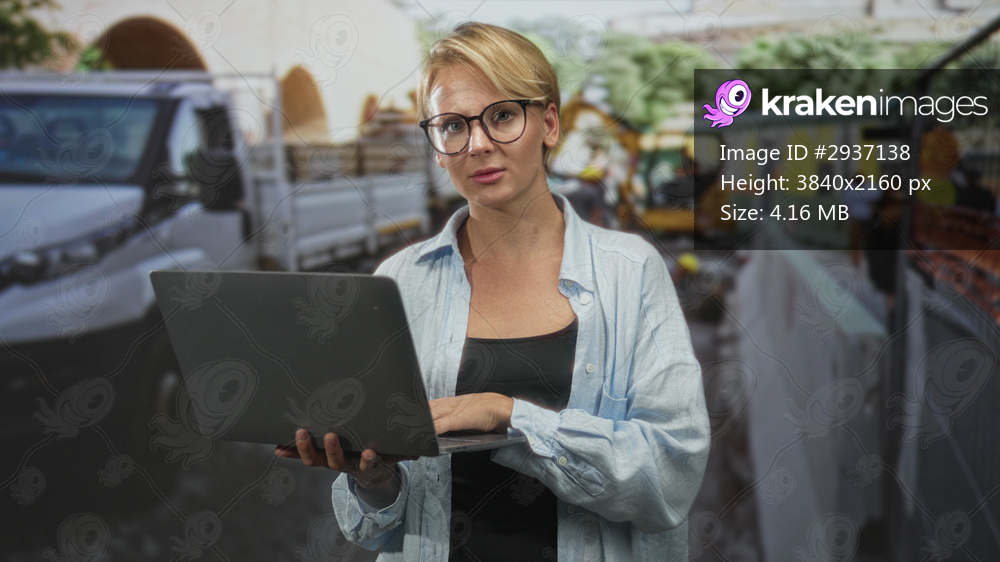 Woman holding laptop and typing with hands while wearing glasses and a light shirt amid trucks and excavator on street construction site; site management focus. - Kraken Images