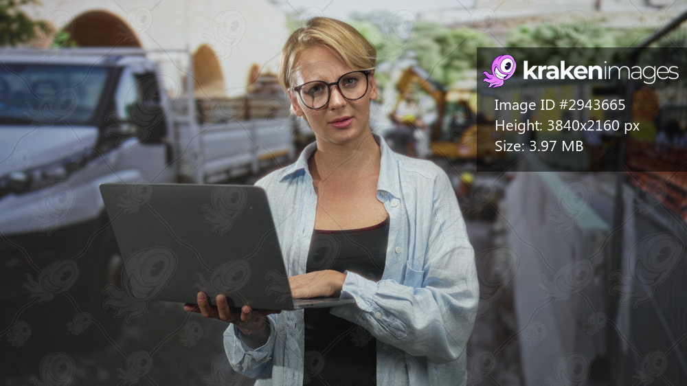 Woman holding laptop and typing with hands while wearing glasses and a light shirt amid trucks and excavator on street construction site; site management focus. - Kraken Images