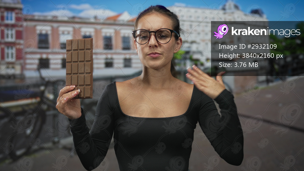 Woman holding large chocolate bar on amsterdam street canal, eyes closed and hand flick gesture near bicycles and historic building; disgust refusal.