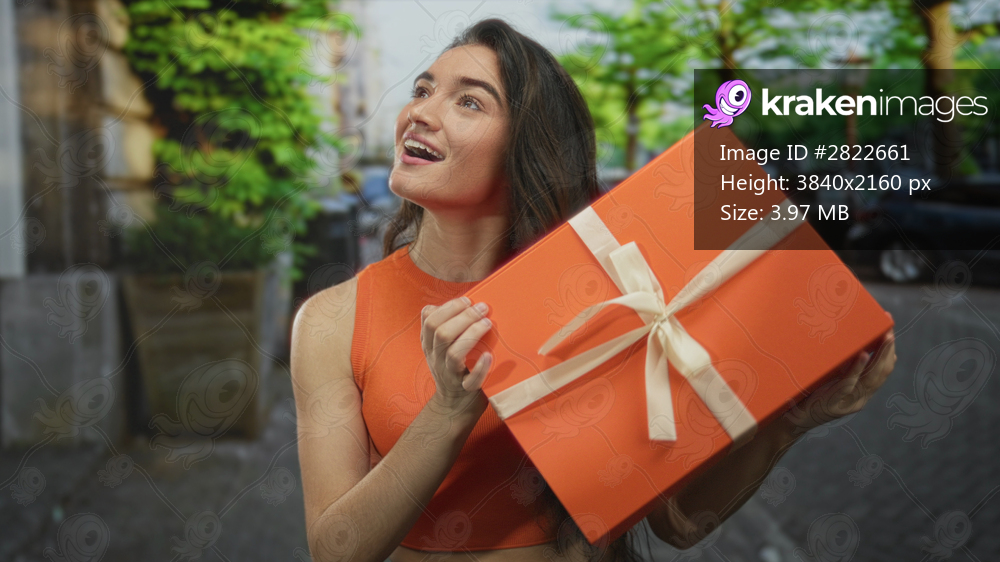 Woman holding large orange gift box with ribbon on cobblestone street, mouth open in surprise; joy celebration.