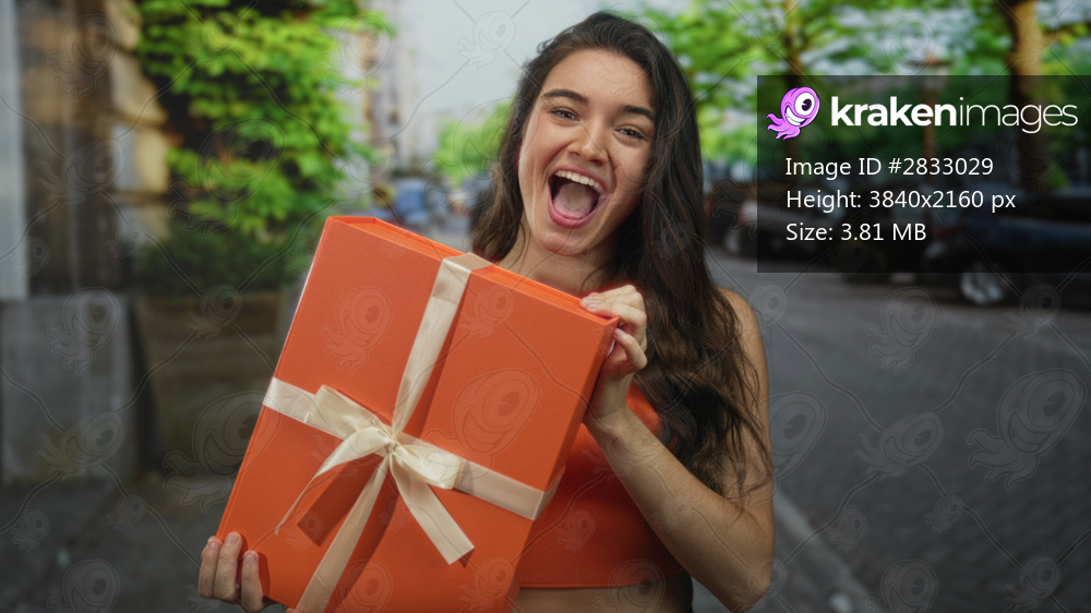 Woman holding large orange gift box with ribbon on cobblestone street, mouth open in surprise; joy celebration.