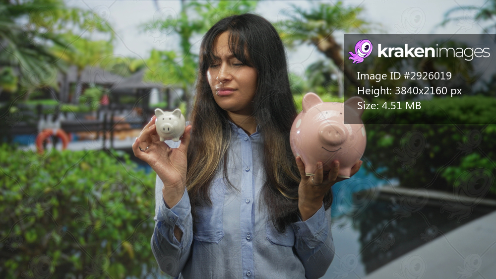 Woman holding large pink piggybank and small white piggybank with hands at pool resort; savings decision uncertainty.