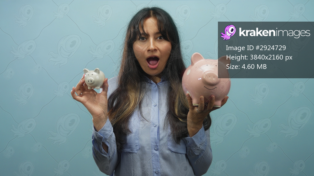 Woman holding large pink and small white piggy banks with open mouth gesture in light blue studio; surprise savings decision.