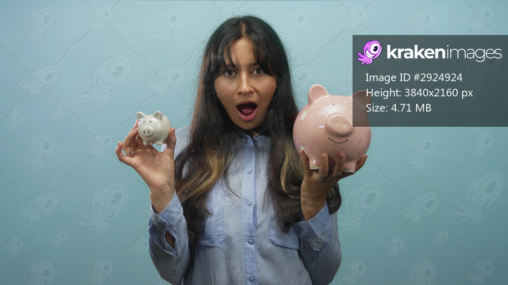 Woman holding large pink and small white piggy banks with open mouth gesture in light blue studio; surprise savings decision.