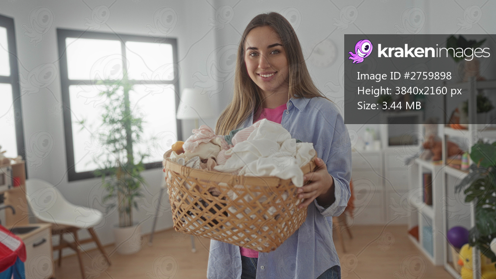 Woman holding laundry basket in bright home with indoor plants and natural light creating a serene cleaning atmosphere for young household chores.