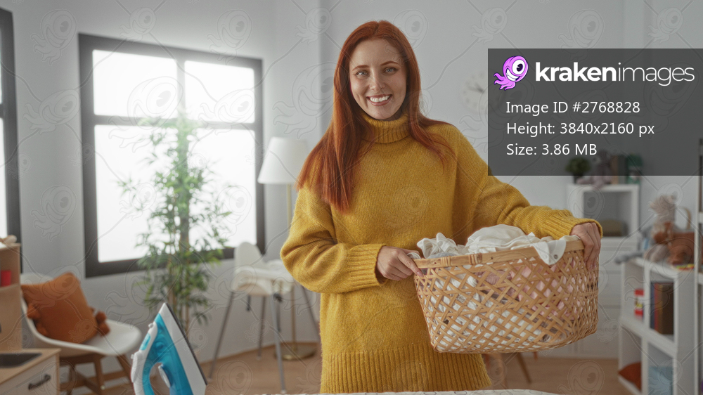 Woman holding laundry basket in cozy room with bright window showing indoor housework scene with redhead wearing yellow sweater and modern decor around. - Kraken Images