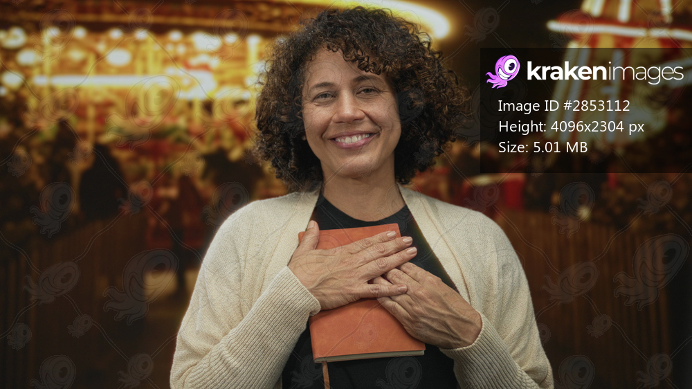 Woman holding leather journal close to chest at night street fair under glowing lights; serenity reflection.