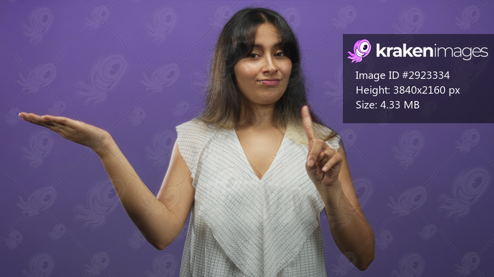 Woman holding left palm up in a purple studio presenting an open hand and raising one finger slightly as if weighing options; doubt hesitation choice.