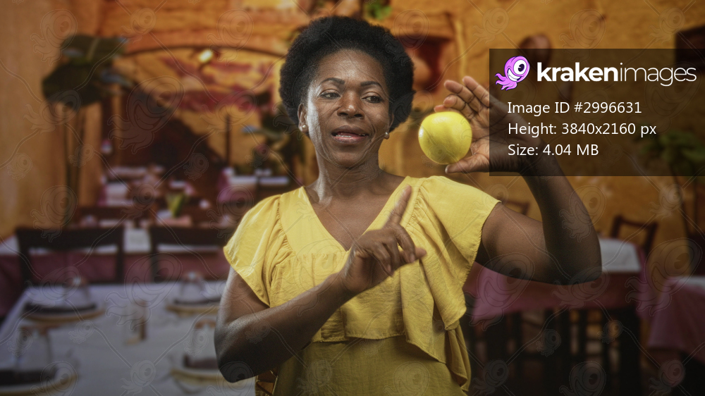 Woman holding lemon and pointing finger inside building dining area with tables and chairs visible; curiosity discovery.