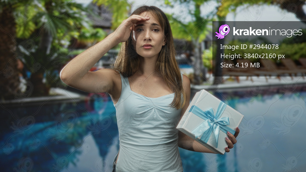 Woman holding light blue ribboned gift box shading her eyes at a resort pool with palm trees and lounge chairs nearby; summer heat relief.
