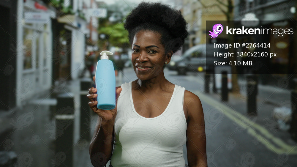 Woman holding lotion bottle on city street smiling in tank top, presenting skin care product outdoors with urban background and casual style, promoting youthful appearance. - Kraken Images