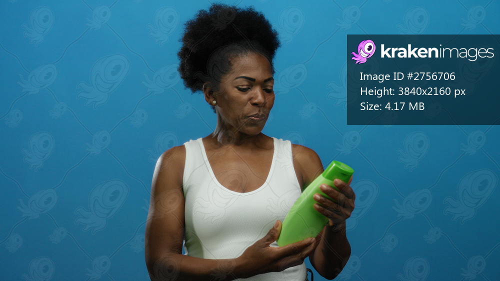 Woman holding lotion bottle over isolated blue background, showcasing product evaluation with a smile, representing skincare and beauty choices.