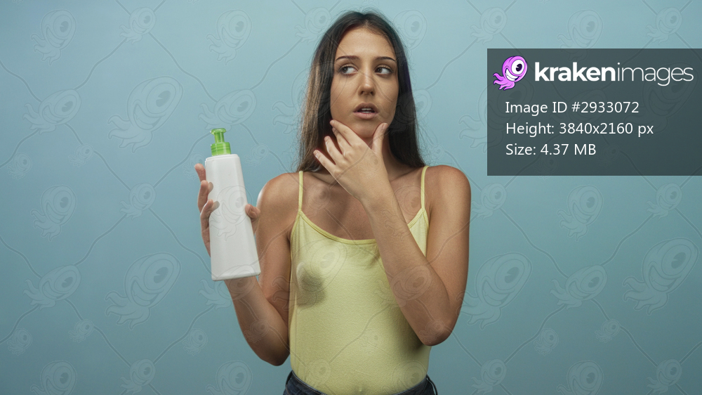 Woman holding lotion bottle and touching chin in studio with pale blue backdrop; doubt skincare trial.
