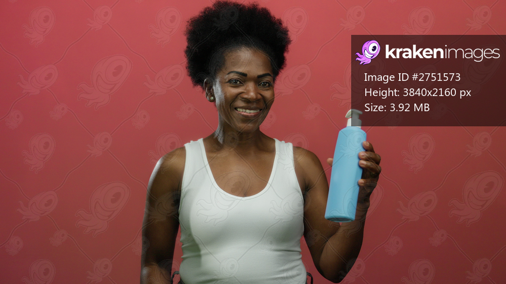 Woman holding lotion smiling over isolated red background with a confident expression in a studio setting showcasing skincare and beauty products.