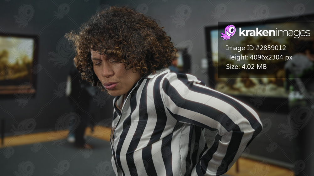 Woman holding lower back with eyes closed in gallery beside paintings, striped blouse, backache; discomfort fatigue strain.