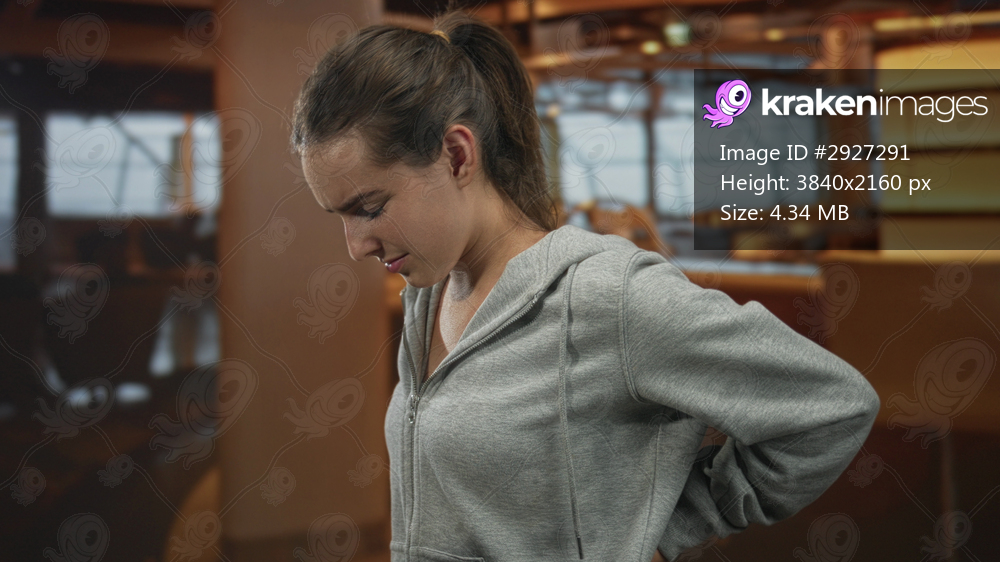 Woman holding lower back with eyes closed showing backache in indoor restaurant seating area, casual hoodie and ponytail; fatigue discomfort.