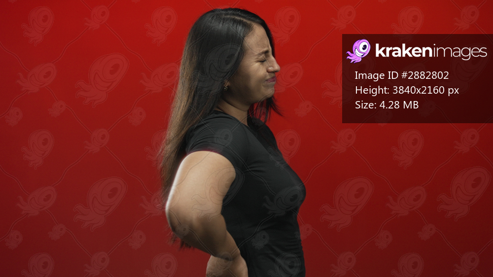 Woman holding lower back in studio against a vivid red backdrop, grimacing and clutching her waist; backache pain.