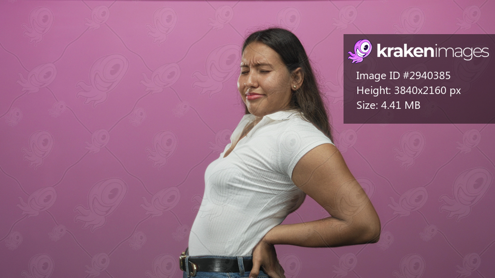 Woman holding lower back in studio with pink backdrop, hand pressing lumbar and grimace on face; pain recovery.