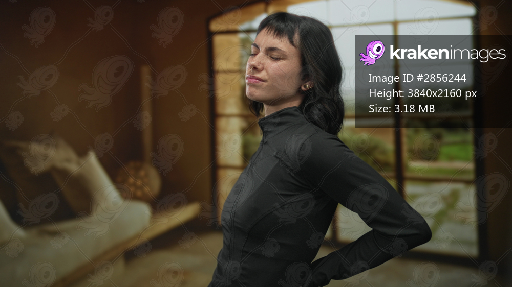 Woman holding lower back and wearing sporty black fitness jacket zipped up in building; physical strain.