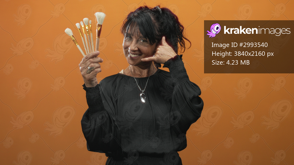 Woman holding makeup brushes with an outstretched hand and hand to ear phone gesture against an orange studio backdrop; playful invitation.
