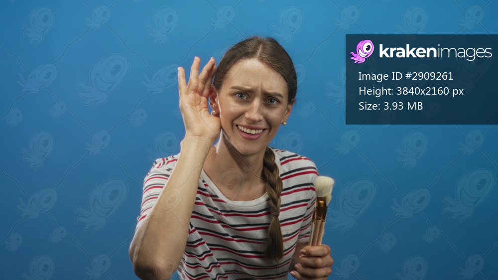 Woman holding makeup brushes and cupping her ear while listening with raised brow in blue studio; confusion curiosity.