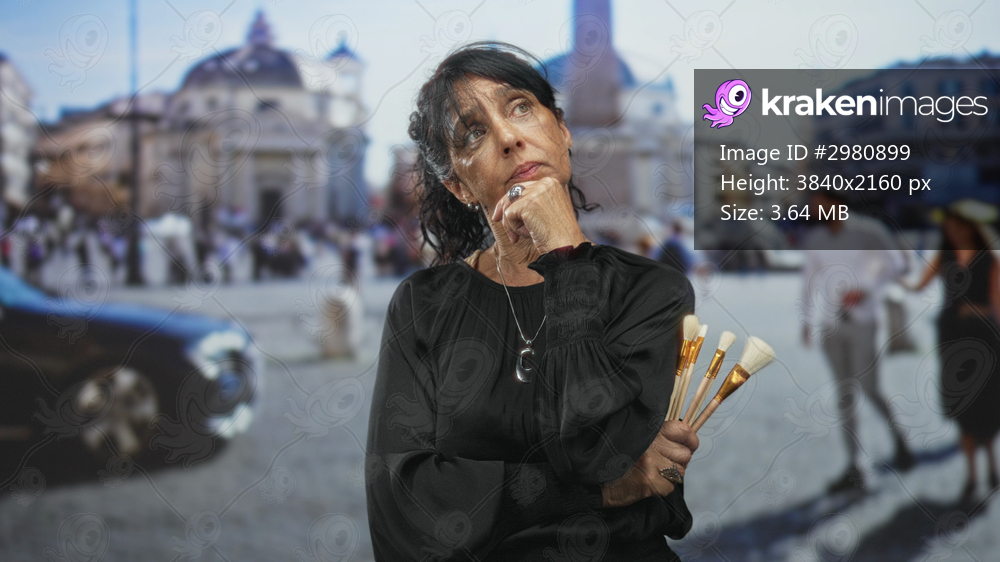 Woman holding makeup brushes with hand on chin in street, city square visible behind her; contemplation creativity.