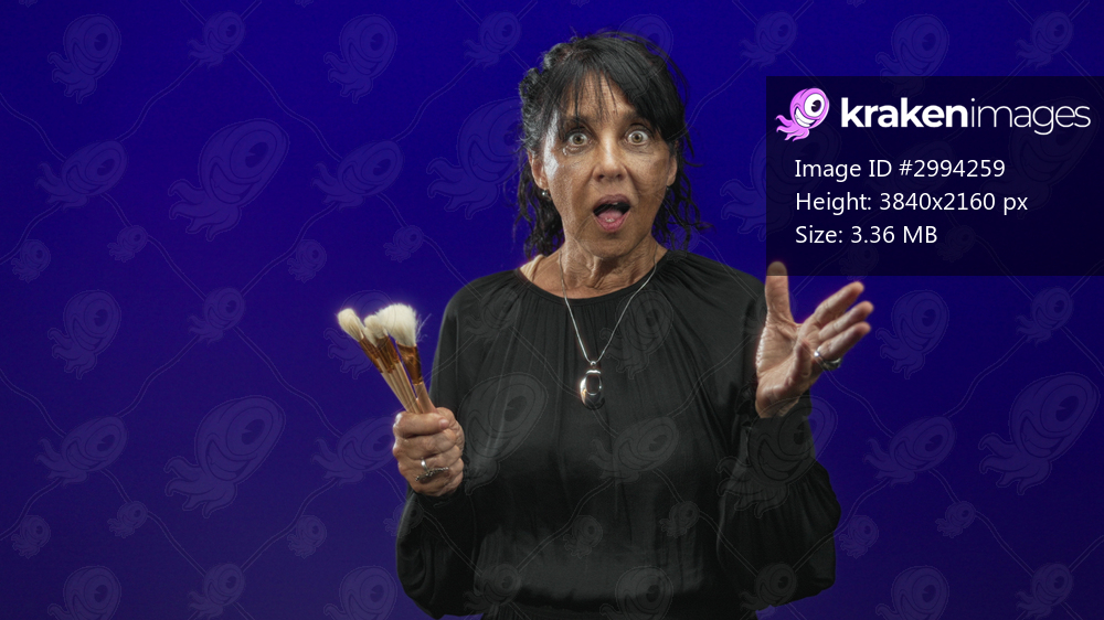 Woman holding makeup brushes with hands visible, looking surprised in studio with deep blue backdrop; surprise curiosity.