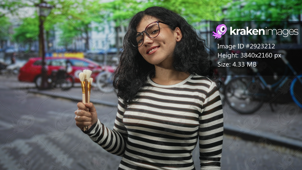 Woman holding makeup brushes on street, smiling with closed eyes and offering brushes to camera; beauty art creative cheerful.