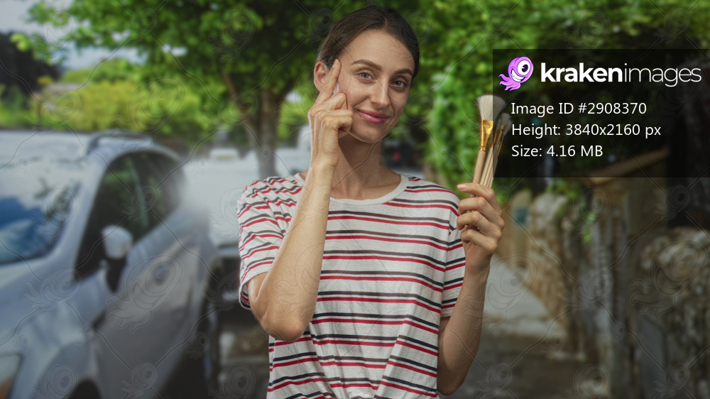 Woman holding makeup brushes points finger to cheek in street near parked car and stone wall; confidence self care.