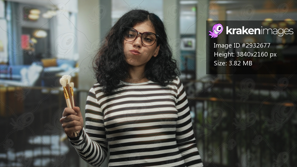 Woman holding makeup brushes and smiling in a hotel building lobby; beauty creativity confidence empowerment.